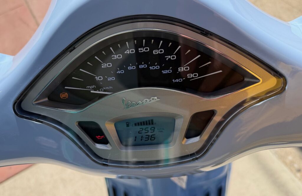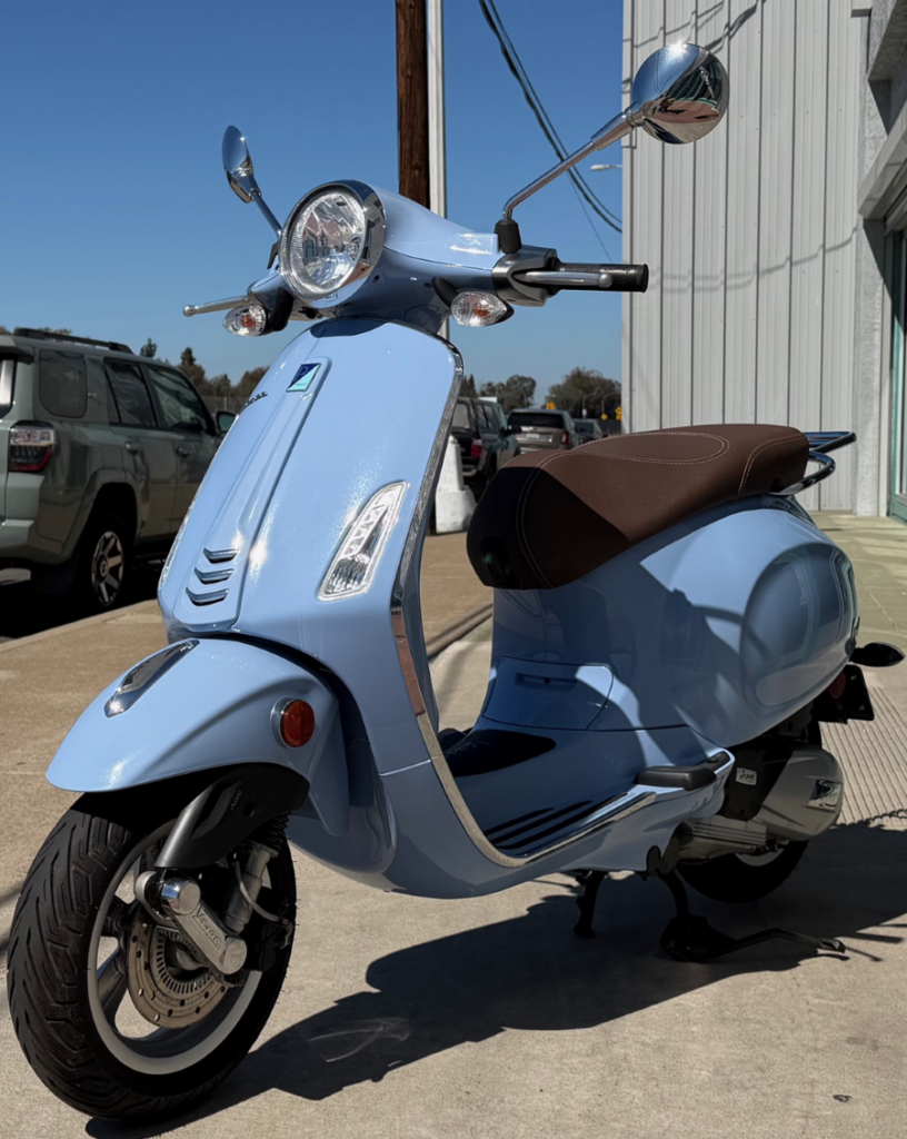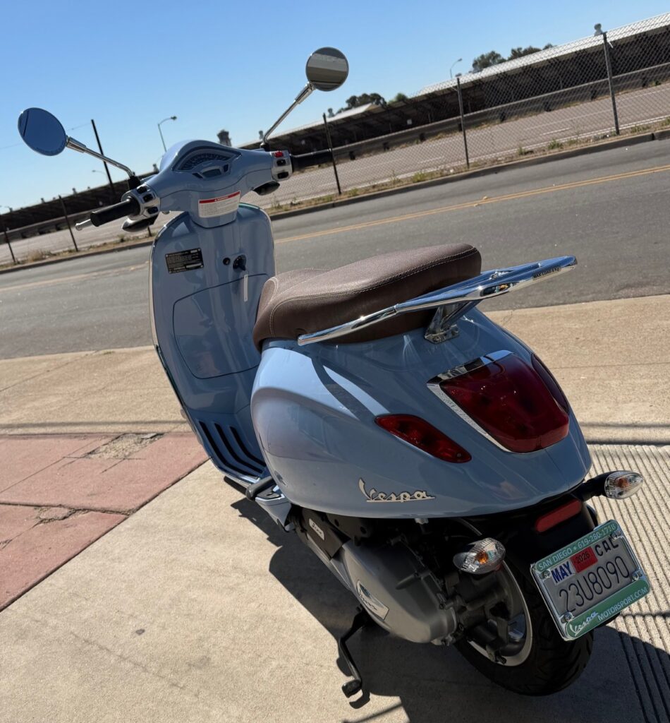 Just in, another pristine, low mileage, rare color Vespa Primavera 150! This was a one year only color, and is the second one we have ever had to offer for resale. Paint and body are gorgeous, everything works perfectly, and it drives and stops like new. Features full auto transmission, electric start, front disc brake with ABS and rear chrome rack. Comes with our standard 30 Day Vespa Motorsport Warranty. Our very own Robot just went through this beauty from stem to stern… and it’s ready for summer fun!