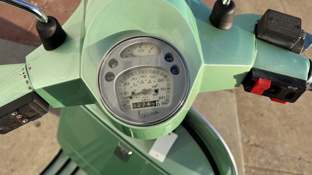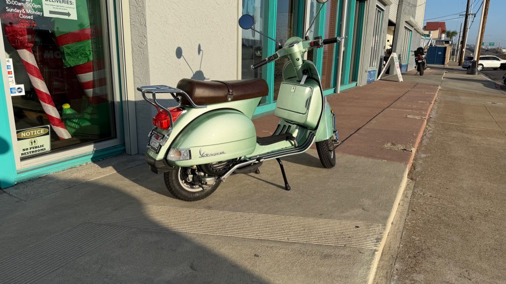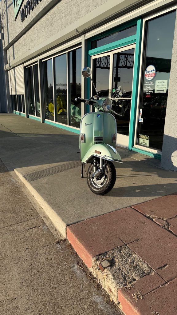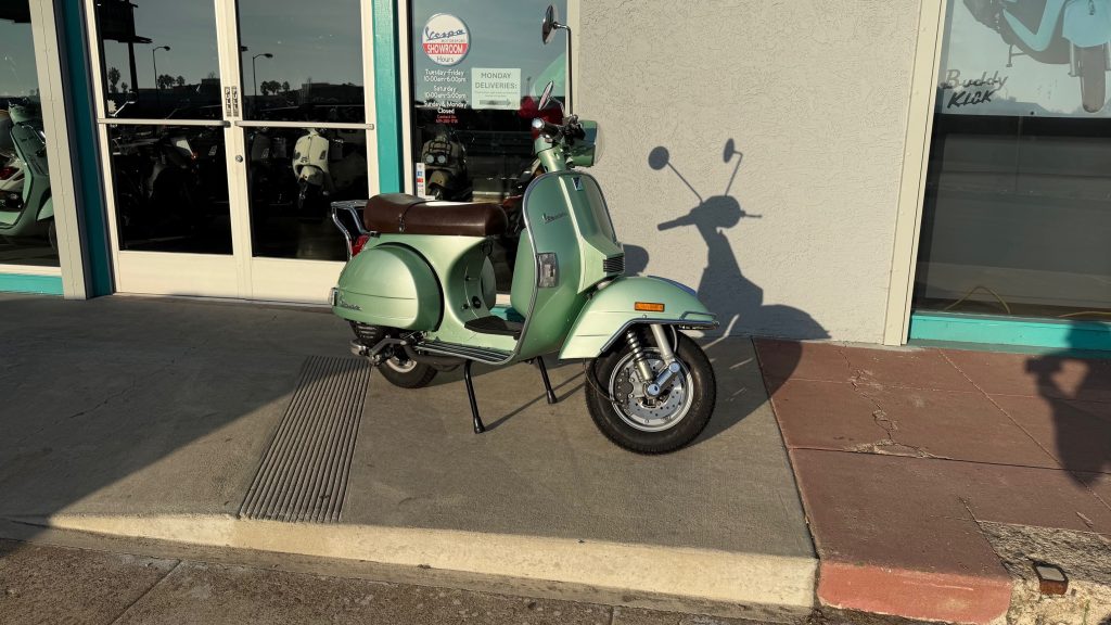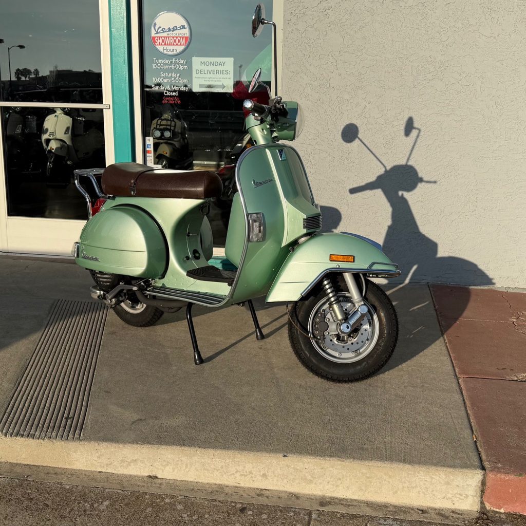 Here is a CLASSIC 2005 Vespa PX 150 “Serie America”, #378 of 500 made for the USA! This would be the last year a 2-Stroke 4-Speed “shifty” would be brought into the USA. None were cleared for CA, as they could not make it through C.A.R.B. (California Air Resource Board), however this example has been registered and titled in California, so it is ready to go. Features electric and old school kick start, disc brake, auto lube oil mix, manual choke, spare tire all wrapped in an immaculate gorgeous vintage green pain scheme. It runs like a brand new 2-stroke, and is a blast to shift through the gears while the exhaust serenades you to that old time “Pop pop pop” sound of another era.